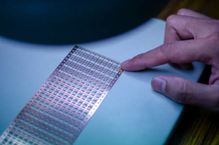 Engineer factory worker electronics works with a chip (board). Microchip Production, Nano computer Technology and manufacturing technological process