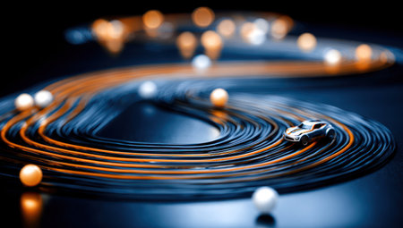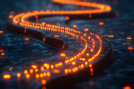A glowing, winding circuit-like pathway emits orange light over a dark, grid-like surface, symbolizing futuristic technology, digital innovation, and advanced electronic design. ideal for themes of connectivity and cyber landscapes. Generative AI
