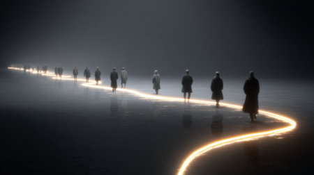 Silhouetted figures journey along a luminous trail in a dimly lit, otherworldly setting, evoking a sense of wonder and intrigue.