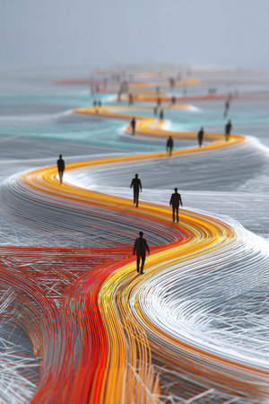 A winding path directs people in a vibrant setting where choices are made based on data, illustrated with bold colors and lines.