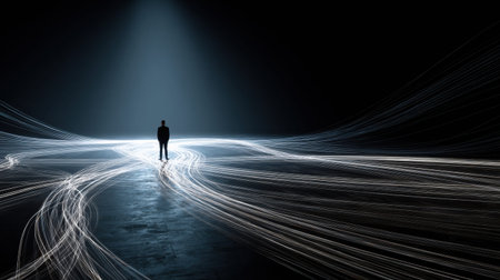 A figure faces various abstract paths in a dark space, indicating different choices and future directions to consider.