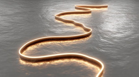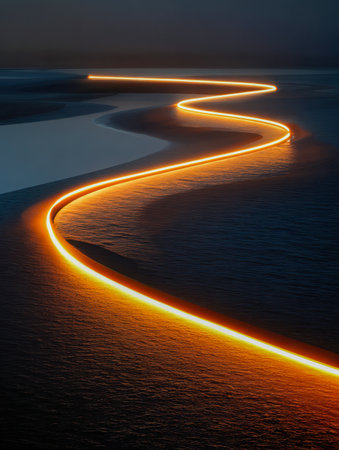A captivating illuminated line winds across a reflective surface, exuding a modern and tranquil aesthetic perfect for artistic projects.