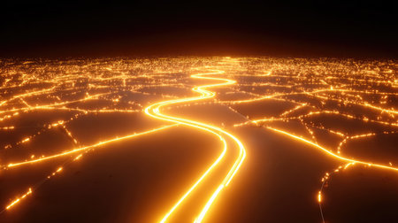This captivating aerial view features glowing digital pathways that wind through an abstract landscape, creating a mesmerizing visual of light trails illuminating the night.