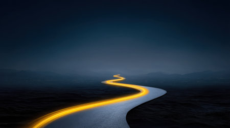 A captivating night view showcasing a glowing road winding through a dark landscape, evoking a sense of adventure and serenity, ideal for travel-themed projects.