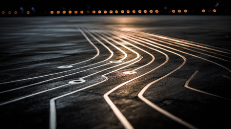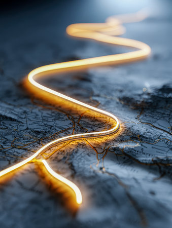 An abstract image presents illuminated lines traversing a dark surface. The composition showcases a network of pathways, enhanced by light and shadow, creating depth. The style is modern, with focus on graphic elements. This image is suitable for digital media, conceptual design projects, or thematic illustrations.
