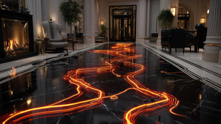 Low-angle shot inside a grand, richly decorated room featuring highly reflective black marble flooring, traversed by bright, winding orange light streaks suggesting movement or energy flow. The background includes classical architectural elements like columns, a burning fireplace, and luxurious seating areas, all contributing to a high-end, dramatic aesthetic.