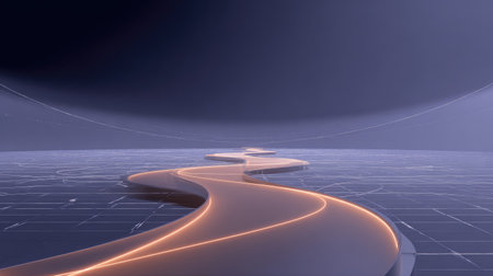 Explore an abstract digital landscape featuring a winding path illuminated by glowing lines, set in a captivating futuristic space environment.