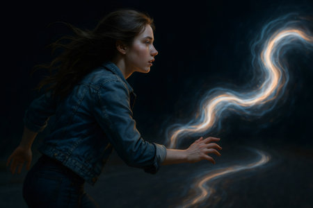 Young woman running through the darkness, following a mesmerizing trail of magical energy that glows with ethereal light and mystery