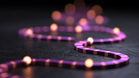 A captivating abstract image featuring a pathway of purple checkered blocks intertwined with glowing orbs, set against a dark textured surface, ideal for creative projects.