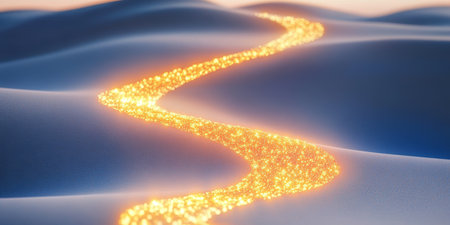 This image features a glowing golden pathway winding through darkness, adorned with sparkling particles, creating an enchanting atmosphere filled with warmth.