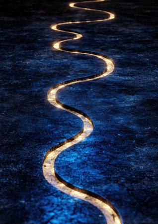 A mesmerizing curving path of golden light gracefully flows through a dark setting, creating an enchanting atmosphere perfect for artistic projects and backgrounds.