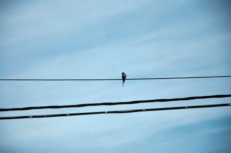 Common swallow on an electricity line. Blue sky. Soria, Spain