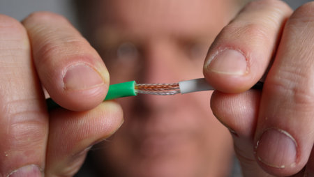 A technician carefully untangles a mass of colorful wires while repairing electronic equipment in a well-lit workshop, showcasing intricate craftsmanship.