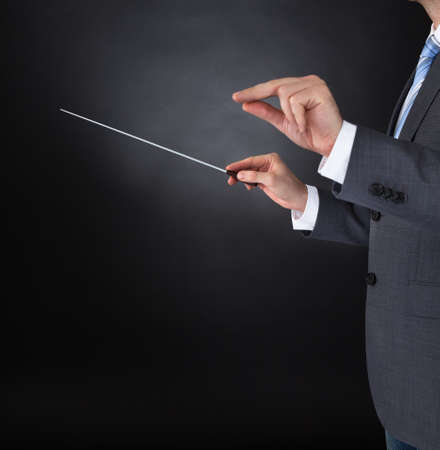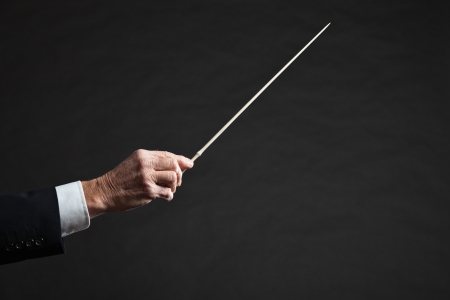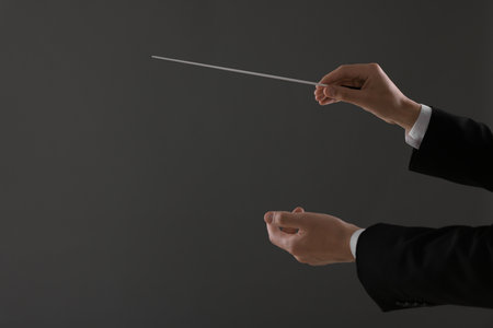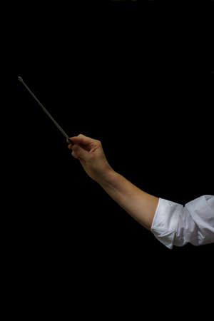 Closeup of the hands of a music conductor with a baton against a dark studio background with copyspace