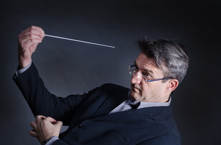 side view of an elegant music conductor holding a batton ready to direct a music concert, business concept, on black studio background