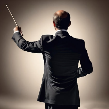 Warmly lit image showcasing a focused orchestra conductor with baton in hand during a classical music concert in an opulent hall.