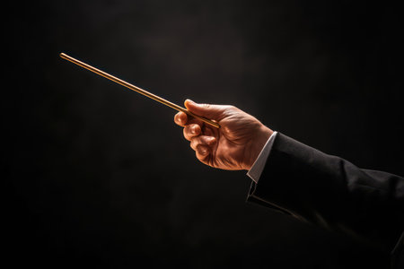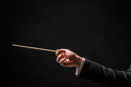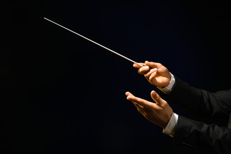 Music conductor in action holding baton on black background symbolizing classical performance and leadership.