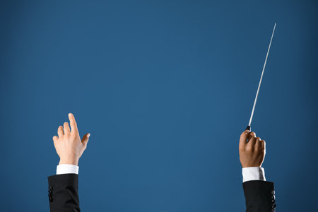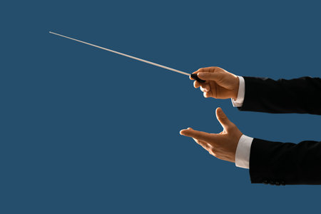 Male orchestra conductor hands, one with baton. Silhouette against blue background.