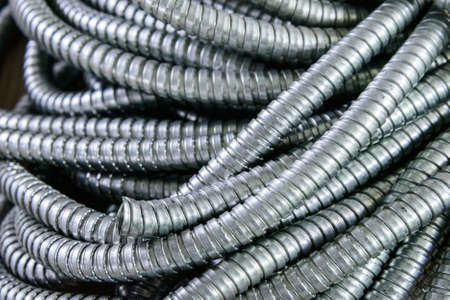 Close-up of a huge bunch of metal flexible tubes with nuts interconnected in a factory. The concept of modern electronic and IT technology.