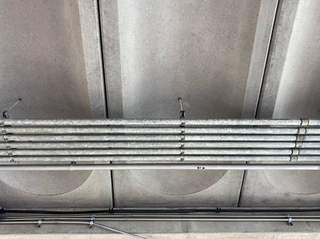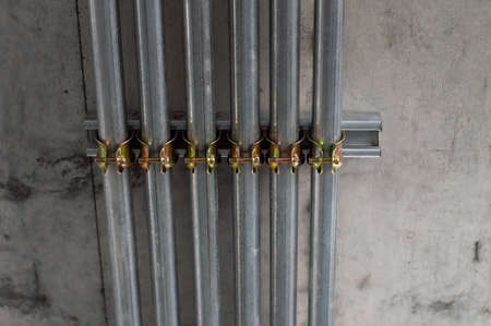 galvanize pipe of electrical system with support installed on the ceiling. infrastructure in construction site.Close up of a stainless steel in a building under construction.