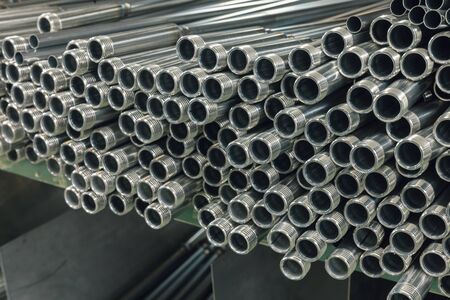 stack of steel electric conduit pipes, black and white tone, selective focus, industry concept background