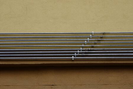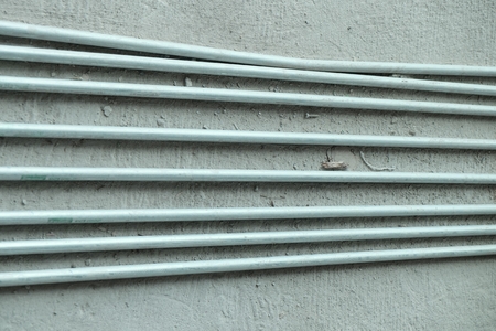 Aluminum tubing for wire protection lined up on old concrete wall .