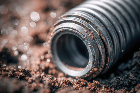 A close-up of a ridged black plastic conduit emerging from damp earth, with glistening droplets and a soft, blurred background highlighting ecological renewal.