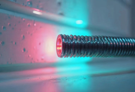 Shiny metal threading extends towards the lens, bathed in a mix of vibrant pink and blue lights.