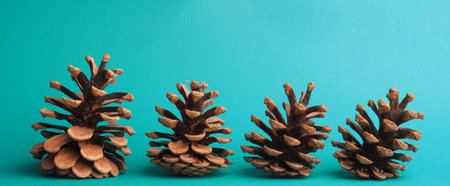 Four pine cones in a row on a turquoise background with space for text, seasonal or Christmas banner