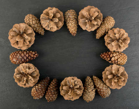 Christmas frame made of cones on a dark wooden background. Christmas, winter concept. Flat lay, top view.