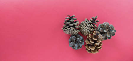 cones on a red background. Several spruce or pine cones on the right. New Year or Christmas theme. Banner.