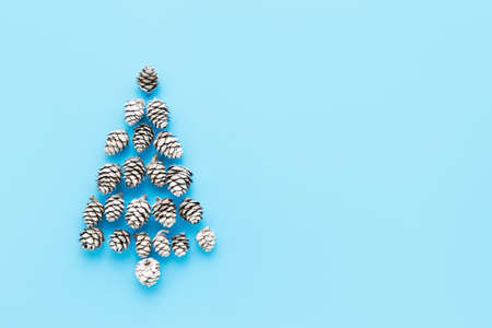 New Year card. Abstract Christmas tree from silver cones on a light blue background. Top view, copy space