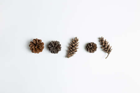 A flat lay image of multiple brown pine cones of different sizes and shapes arranged on a white background.