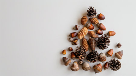 An artistic arrangement of various pine cones and acorns set against a light background, perfect for seasonal decor and crafting projects.