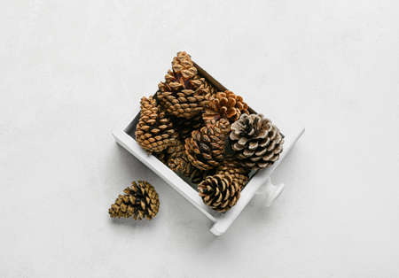 Pinecone frame at white background. Winter background. Christmas festive background.