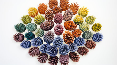 Fir cone painted bg knolling realistic Kodachrome palette. Generative AI Generated