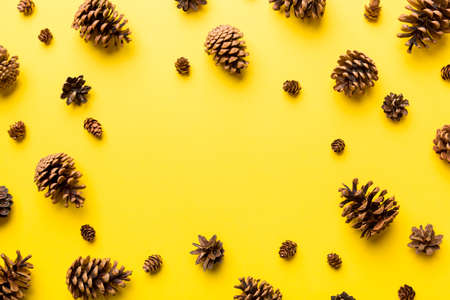 pine cones on colored table. natural holiday background with pinecones grouped together. Flat lay. Winter concept.
