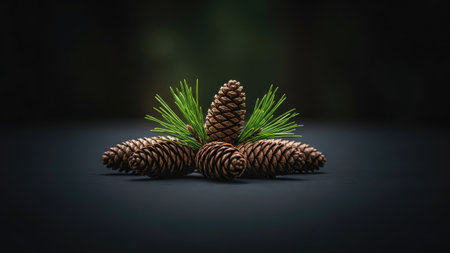 A group of pine cones and fresh green needles are centered against a dark background, creating a natural and focused composition. The image showcases detailed textures and a contrast of warm browns and vibrant greens. This image is suitable for various commercial uses, including advertising and editorial content.