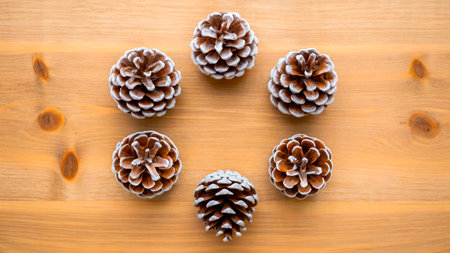 Six pinecones are placed in a circle on a wooden table, with one larger pinecone in the center. The scene is bright with natural light highlighting the textures.