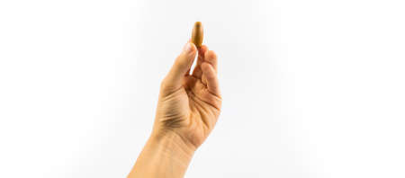 Hand with bullet on gray background. Cartridge 7.62 caliber for assault rifle in fingers closeup with copy space