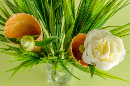 Natural waffle cones with white peony flower on a green background. Festive creative concept for birthday, mother's day, valentine's day
