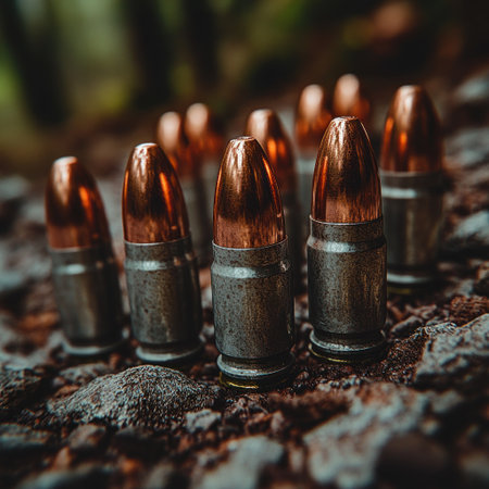 Bullets rest on the ground, glinting in soft, warm light amidst rocks and forest.