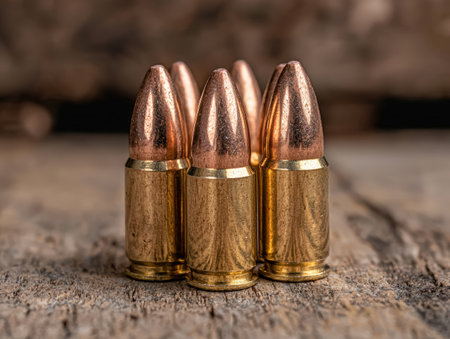 Group of copper and gold bullets reflecting on a dark background, creating a dramatic and intense atmosphere