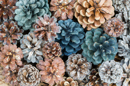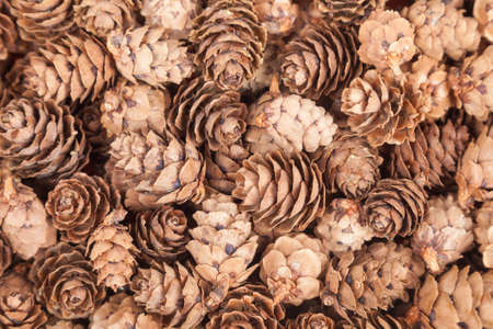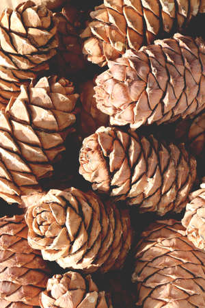 Closeup background texture photo of dried pine cones with natural tone and colored