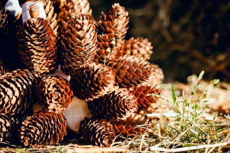 Assorted coniferous cones laying on ground in the garden.
