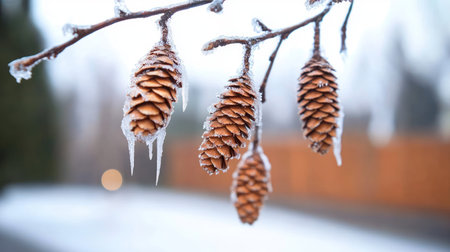 Several brown pine cones, covered in ice, hang from a branch. Icicles form on the cones, showcasing winter's cold beauty.