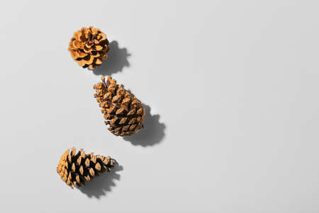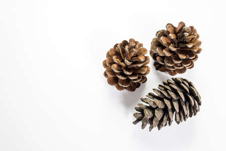 Three dry pine cones are isolated on white background. Copy space. Place for text