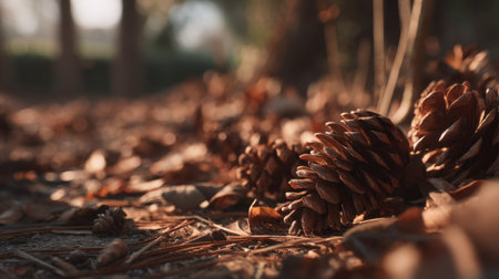 Captivating close-up image of pine cones resting on a bed of fallen leaves, showcasing the natural beauty and tranquility of an autumn forest landscape.