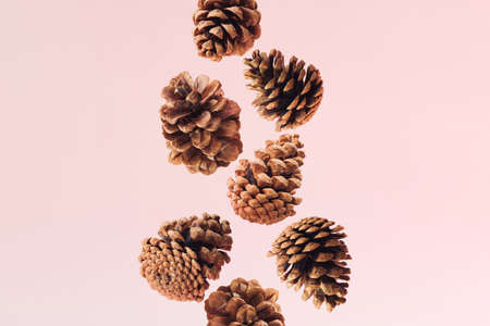 Trendy autumn composition with flying pinecones agains cream background. Creative fall wallpaper.