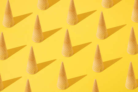 Summer pattern with ice cream cones turned upside down on yellow background. Minimal concept.